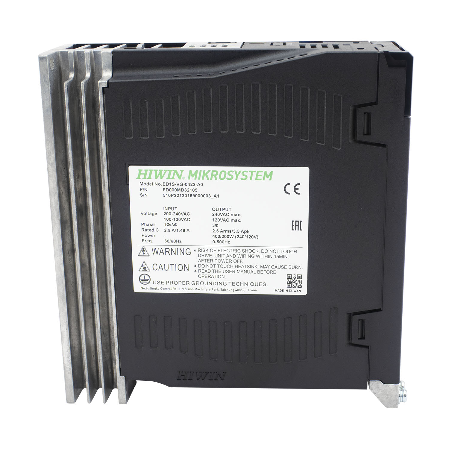 Серводрайвер серии E1 предназначен для работы с серводвигателем мощностью до 0,4 кВт и энкодером с разрешением 23 бит. Может работать с внешним контроллером в режимах задания позиции, скорости, момента или автономно в соответствии с программой, написанной пользователем. Режим управления преобразователем - векторная ШИМ. Запитывается драйвер от 1 или 3 фаз 220В. Для настройки привода на передней панели имеется 7 сегментный дисплей с 4-мя кнопками управления и USB разьем для настройки с ПК. Для управления используется стандартный инитерфейс (импульсный). Драйвер работает с оптоизолированными (до 200 КГц) или дифференциальными импульсными входами(до 5 МГц.) и имеет выход эмулятора энкодера с настраиваемой электронной редукцией. Драйвер поддерживает квадратупные энкодеры, а с помощью ESC можно подключать также аналоговые (SIN/COS) и цифровые (BiSS-C, EnDat 2.1/2.2, Tamagawa) энкодеры, PTC термодатчики и датчики Холла. У драйвера имеется 10 входов, 5 выходов общего назначения и один вход АЦП 16бит. Драйвер поддерживает: