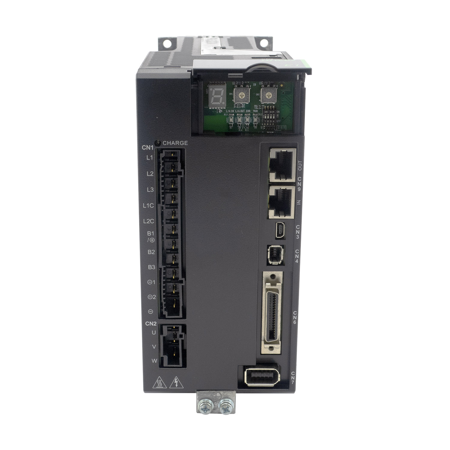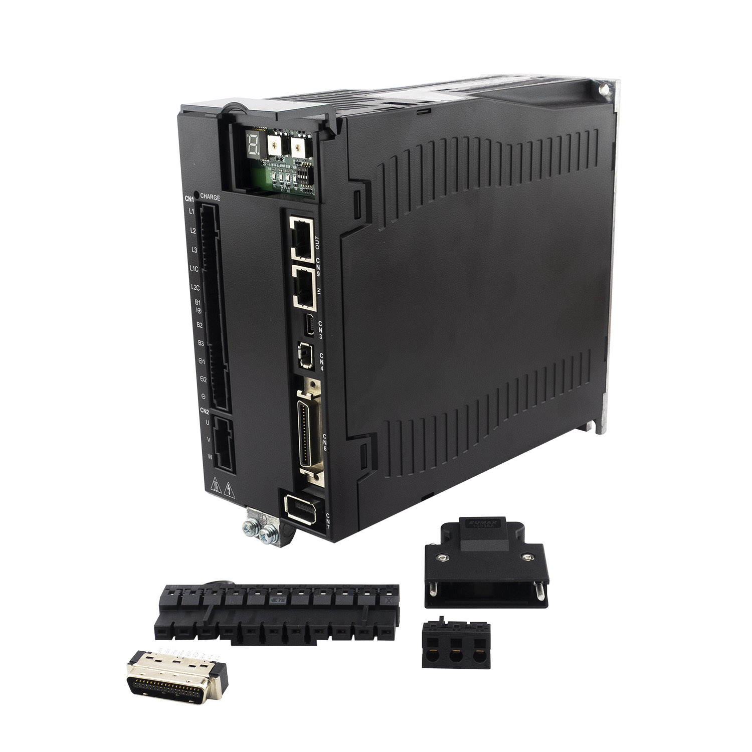 Серводрайвер серии E1 предназначен для работы с серводвигателем мощностью до 2 кВт и энкодером с разрешением 23 бит. Может работать с внешним контроллером в режимах задания позиции, скорости, момента или автономно в соответствии с программой, написанной пользователем. Режим управления преобразователем - векторная ШИМ. Запитывается драйвер от 3 фаз 220В. Для настройки привода на передней панели имеется 7 сегментный дисплей с элементами управления и USB разьем для настройки с ПК. Для управления используется интерфейс etherCAT(CoE). Драйвер имеет выход эмулятора энкодера с настраиваемой электронной редукцией. Поддерживаются квадратупные энкодеры, а с помощью ESC можно подключать также аналоговые (SIN/COS) и цифровые (BiSS-C, EnDat 2.1/2.2, Tamagawa) энкодеры, PTC термодатчики и датчики Холла. У драйвера имеется 10 входов, 5 выходов общего назначения и один вход АЦП 16бит. Драйвер поддерживает: