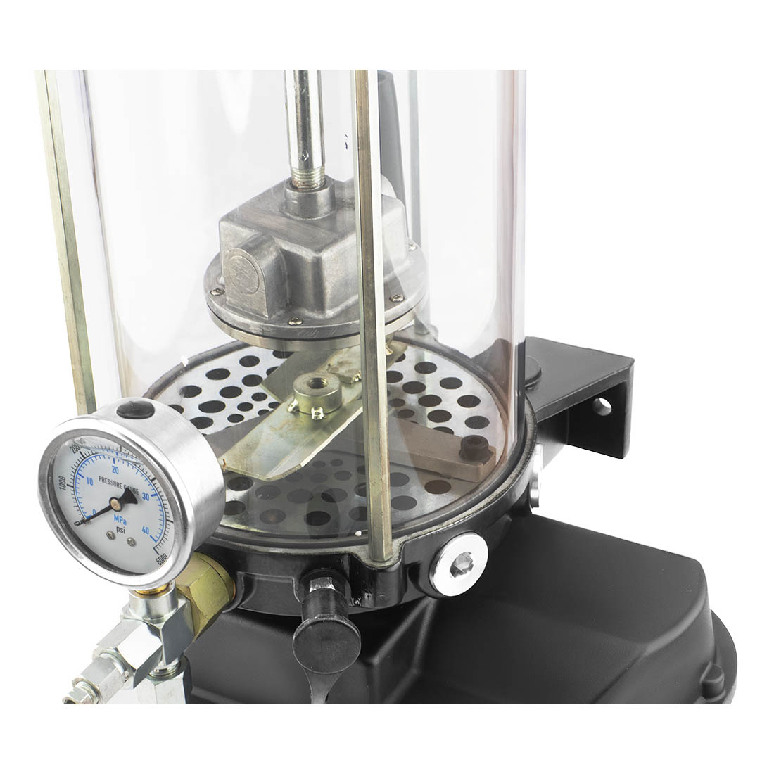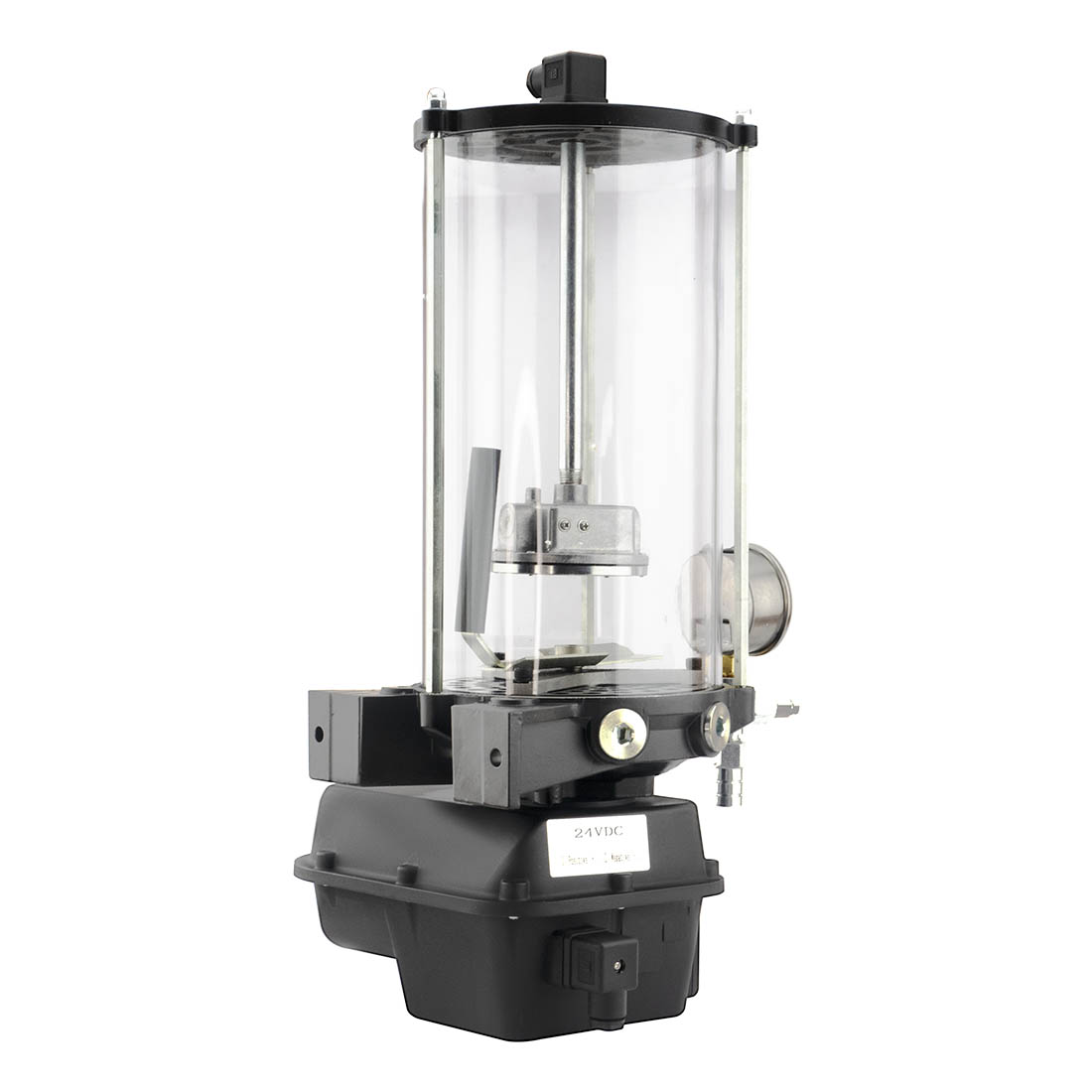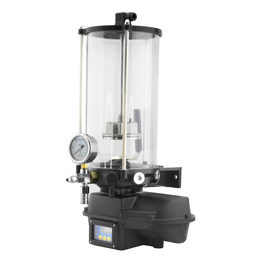 На выходе насоса установлены предохранительный перепускной клапан и манометр, которые обеспечивают безопасность и удобство наблюдения за системой. Встроенный контроллер позволяет автоматически настраивать время работы устройства. Основание масляного бака может быть оснащено датчиком низкого уровня масла для контроля количества смазочного материала.