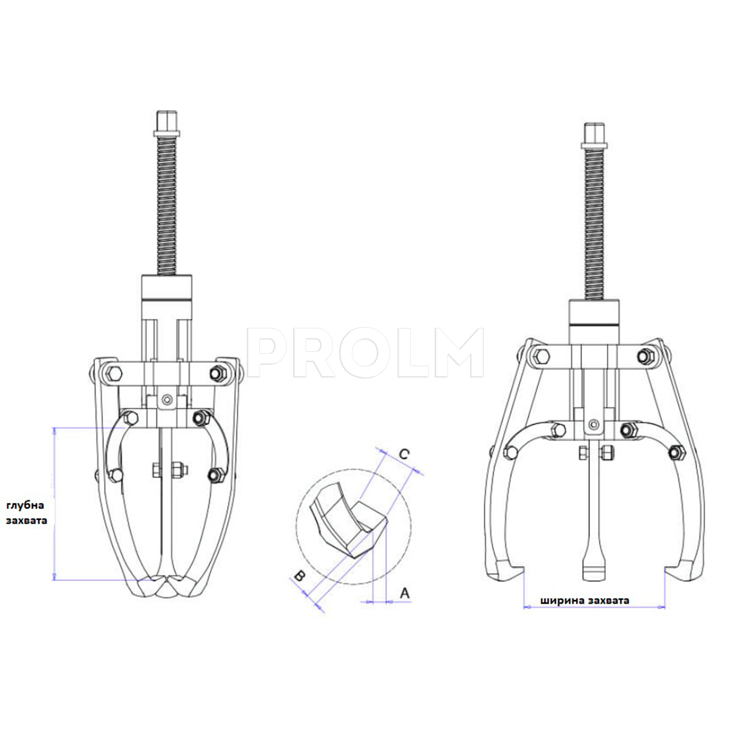 - В конструкции предусмотрена возможность установки 3 или 2 "захватов" с ориентацией лап как внутрь (для демонтажа деталей с вала), так и наружу (для демонтажа деталей из корпуса).