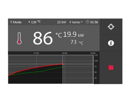 Благодаря среднечастотной технологии осуществляется очень эффективная передача энергии, поэтому заготовка нагревается легко и быстро. ΔT (Delta-T) - мониторинг измеряет внутреннюю и внешнюю температуру заготовки с помощью 2 датчиков. Это обеспечивает полный контроль максимально заданной разницы температур между двумя точками и как следствие - равномерный и однородный нагрев с предотвращением напряжения материала.