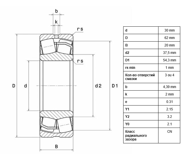 - внутренний диаметр наружного кольца (D1): 54,3 мм;