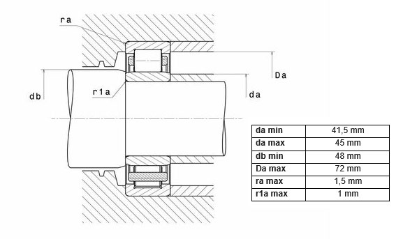 - минимальный диаметр проставочной втулки внутреннего кольца (db min): 48 мм;