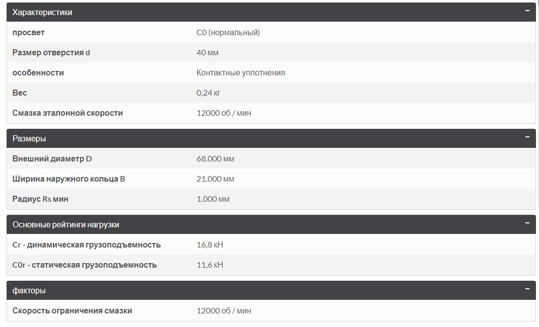 - тип подшипника: 2RS (закрытый подшипник с уплотнениями с обеих сторон);