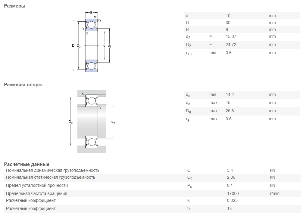 | Номинальная статическая грузоподъёмность | C0 | 2.36 kN |