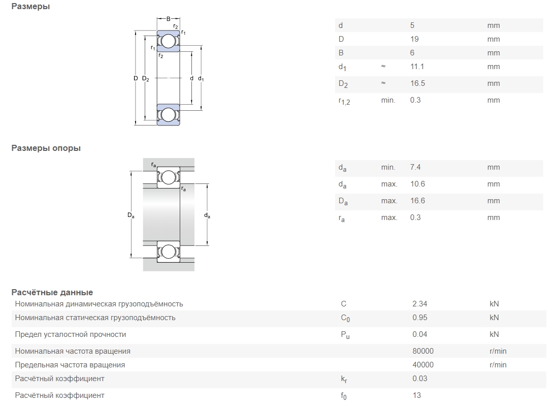 | Номинальная статическая грузоподъёмность | C0 | 0.95 kN |