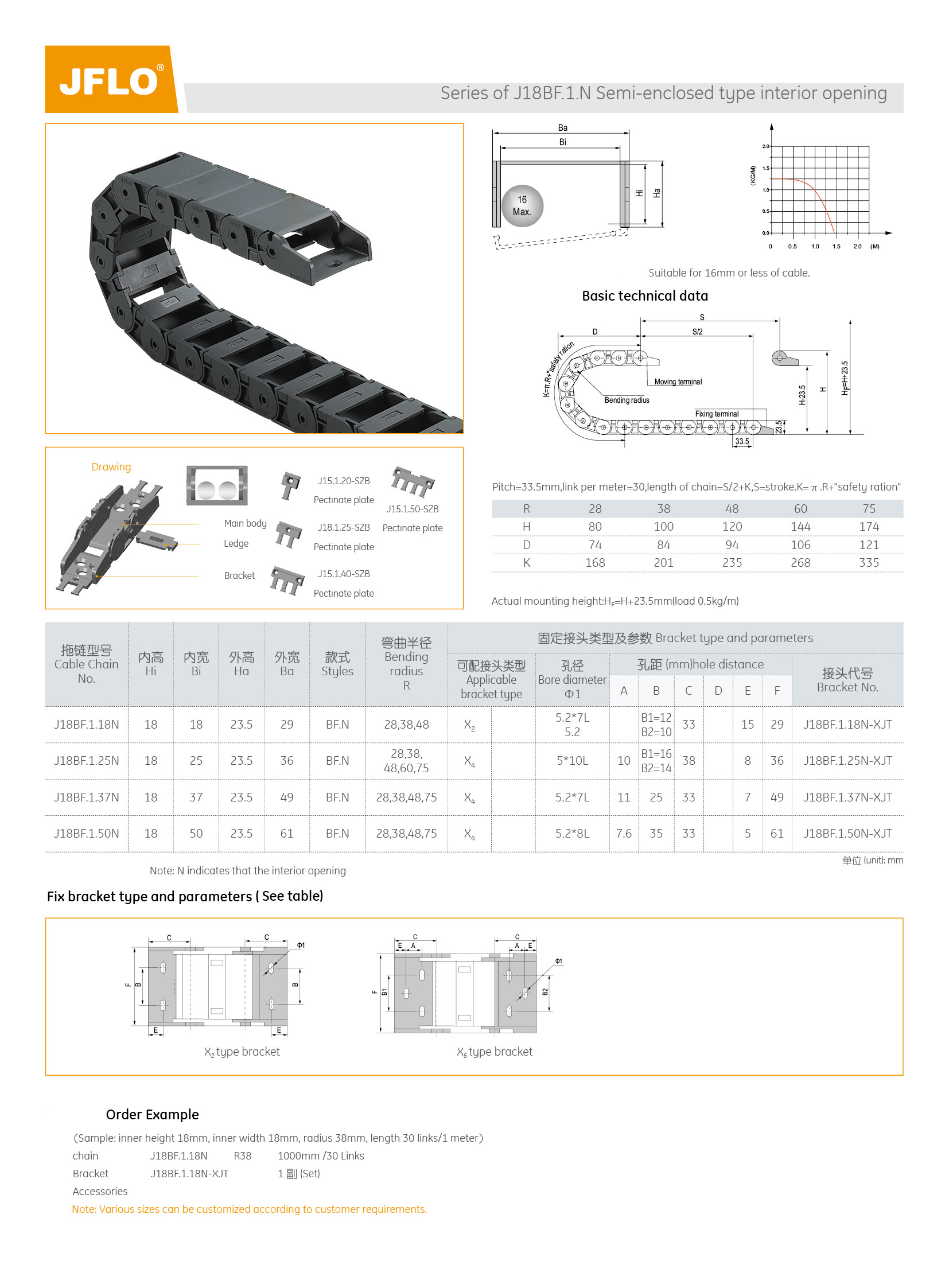 Кабель-каналы серии JFLO J предназначены для защиты и направленного перемещения кабелей и шлангов в подвижных узлах станков, автоматических линий, промышленных роботов и другого оборудования. Конструкция основана на шарнирно-звеньевом принципе, что обеспечивает гибкость, прочность и устойчивость к механическим нагрузкам при постоянных циклах изгиба.