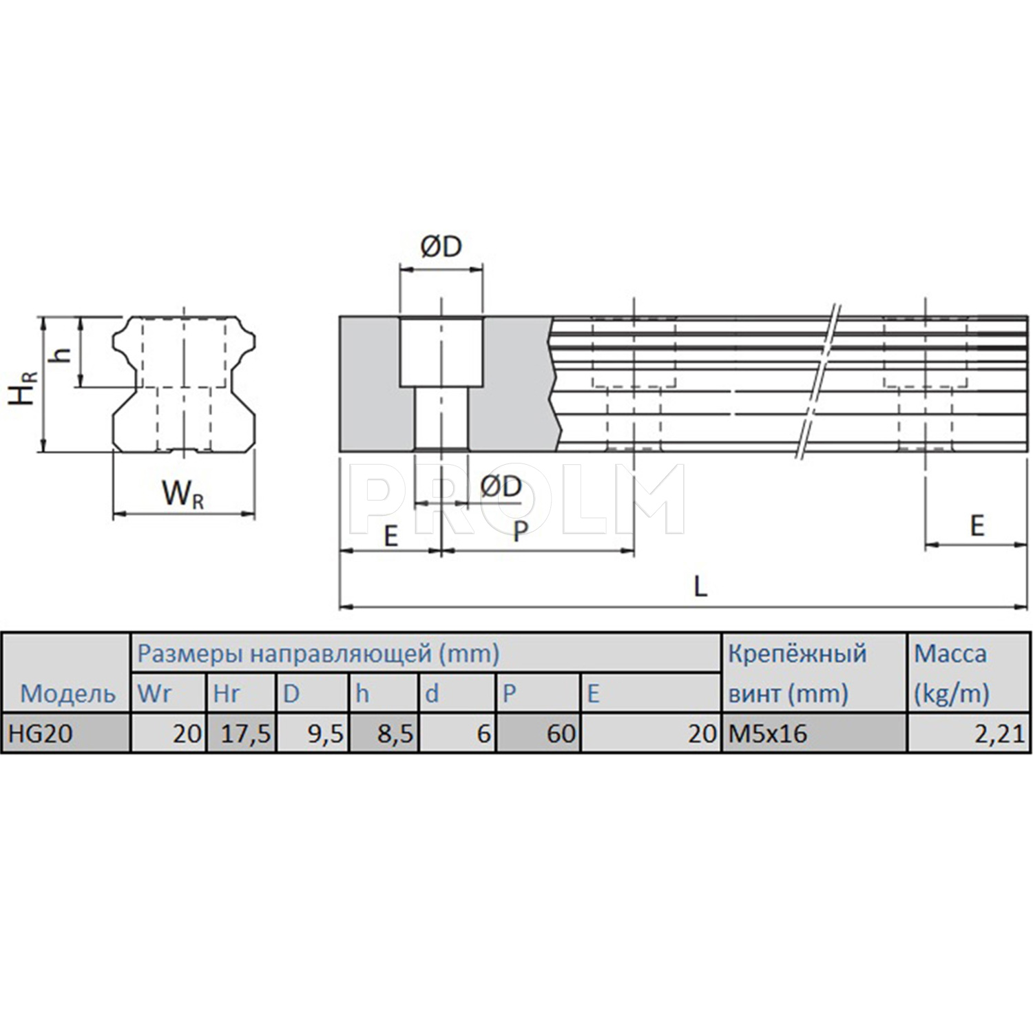 Профильная направляющая (рельс) HIWIN HGR20R_H для систем линейных перемещений имеет следующие характеристики: