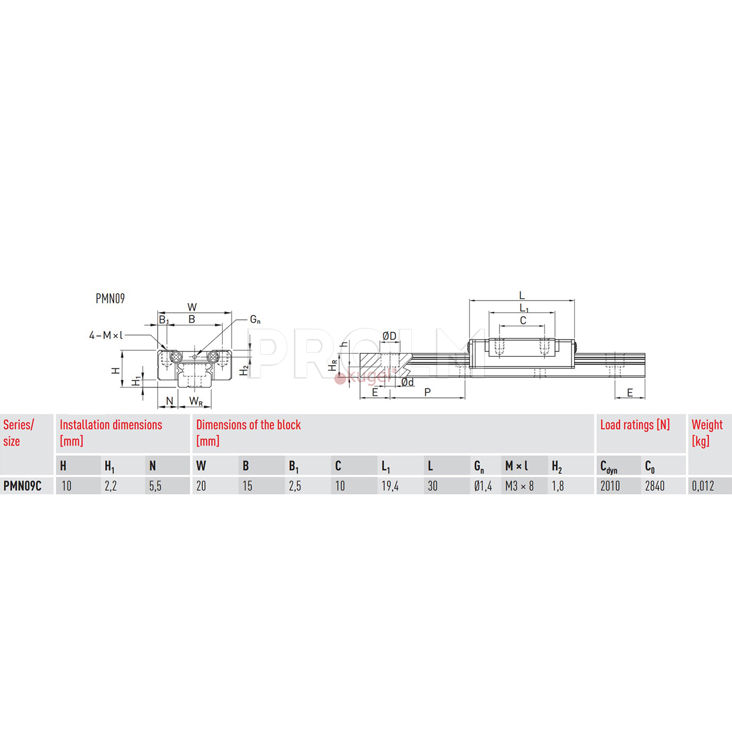 Каретка (также могут использоваться названия "блок системы линейного перемещения", "опорный блок", "направляющий блок", "танкетка", "линейный подшипник", "опорный подшипник" и прочие) HIWIN PMN9CZ0CM имеет следующие параметры: