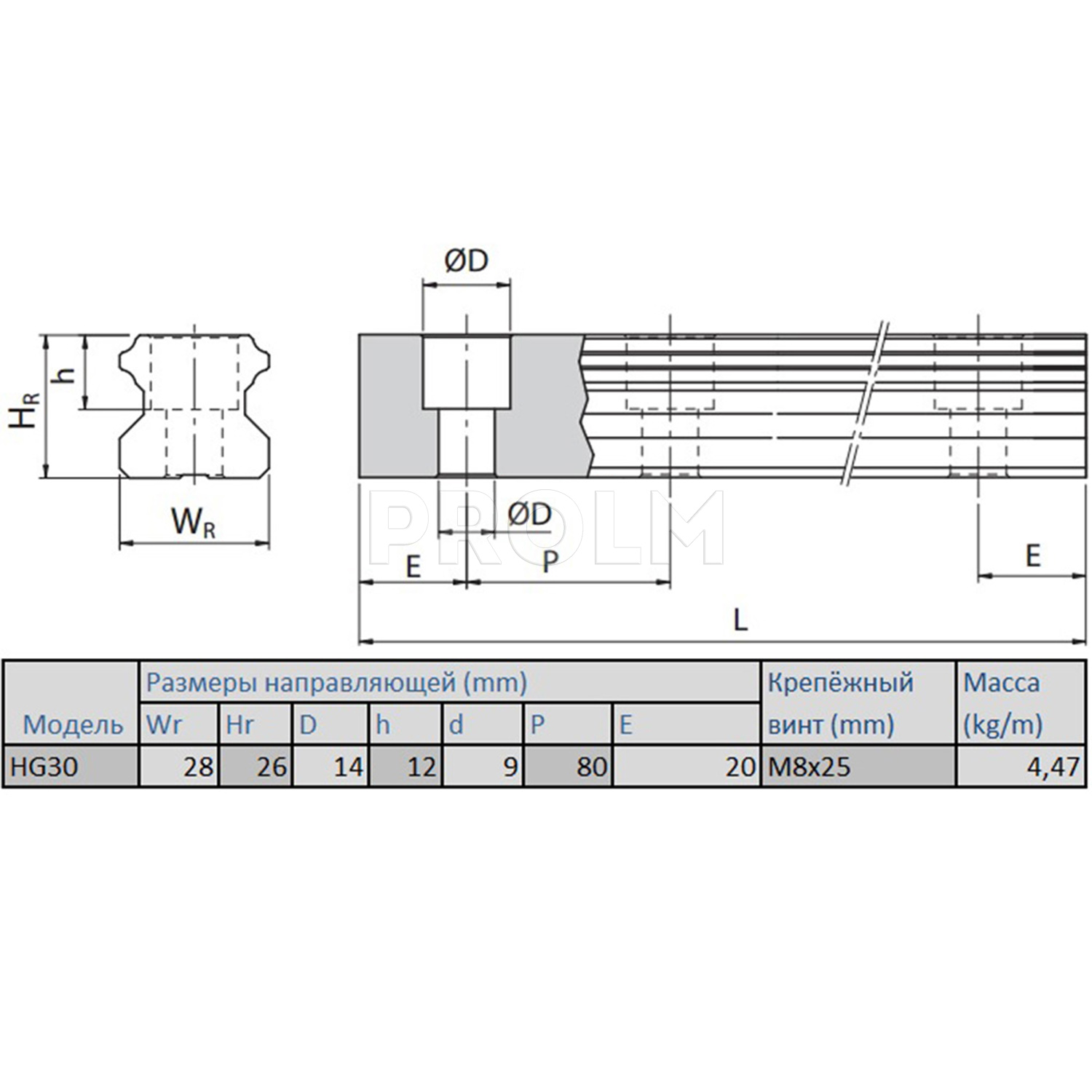 Профильная направляющая (рельс) HIWIN HGR30R_H для систем линейных перемещений имеет следующие характеристики: