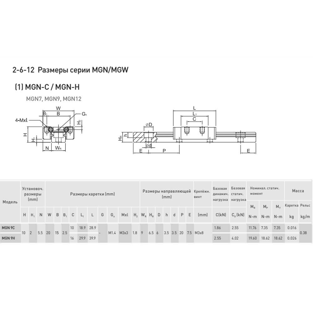 Каретка (также могут использоваться названия "блок системы линейного перемещения", "опорный блок", "направляющий блок", "танкетка", "линейный подшипник", "опорный подшипник" и прочие) HIWIN MGN9CZ1HM имеет следующие параметры:
