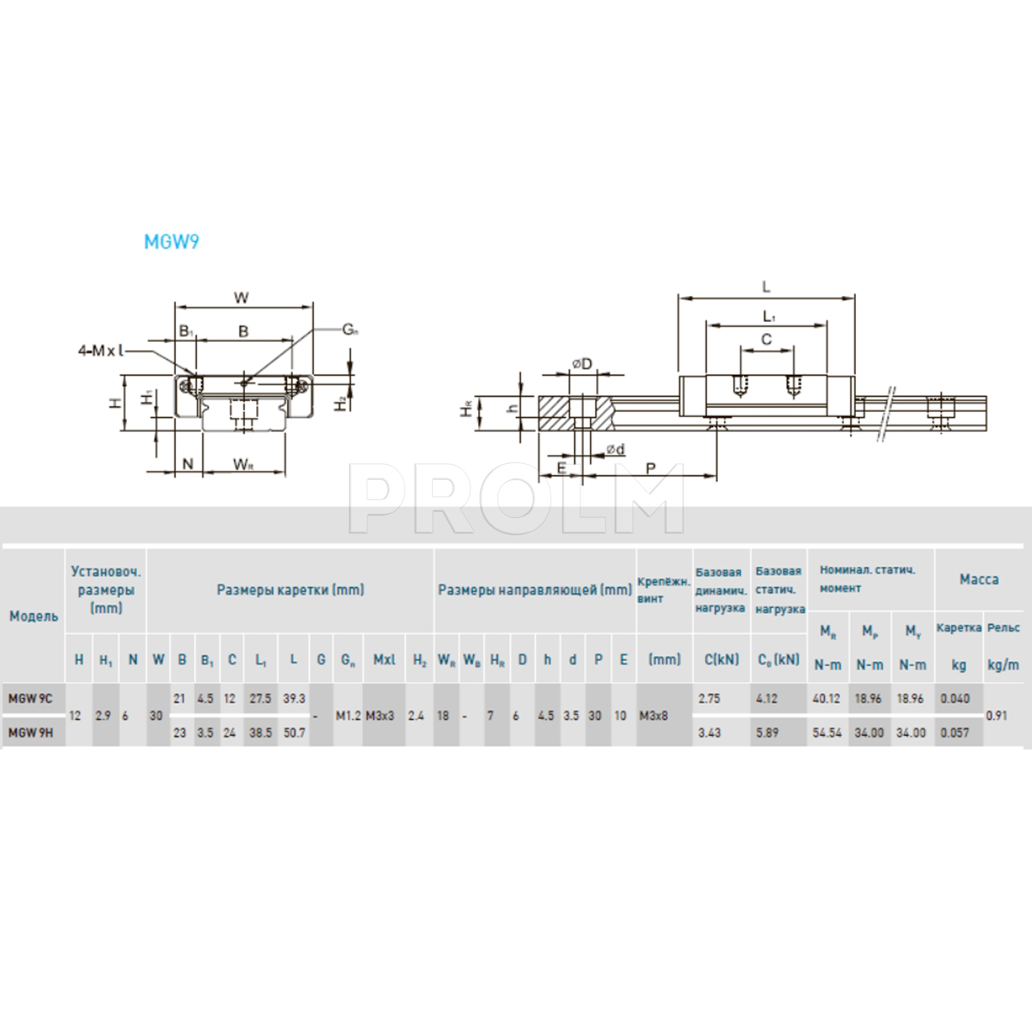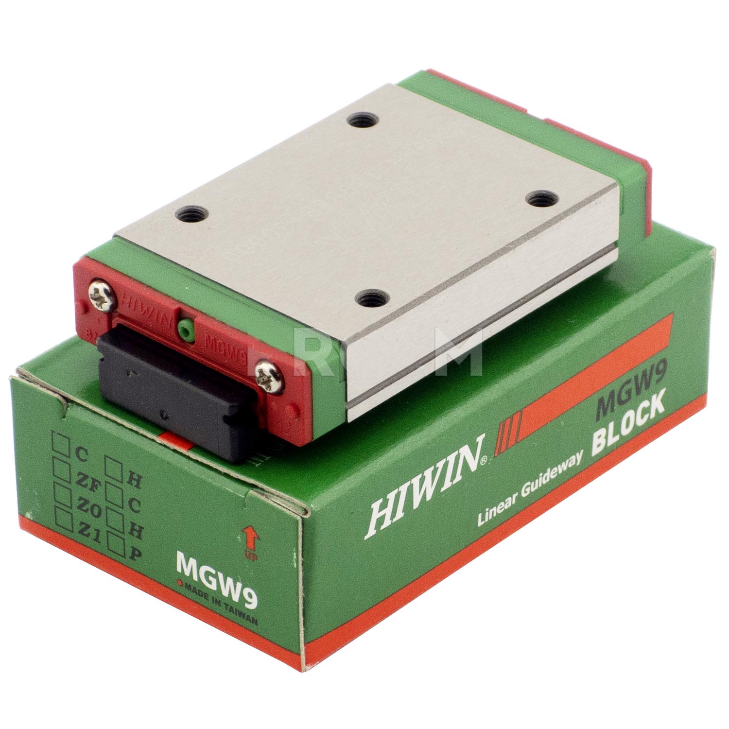 Каретка (также могут использоваться названия "блок системы линейного перемещения", "опорный блок", "направляющий блок", "танкетка", "линейный подшипник", "опорный подшипник" и прочие) HIWIN MGW9HZ0HM имеет следующие параметры:
