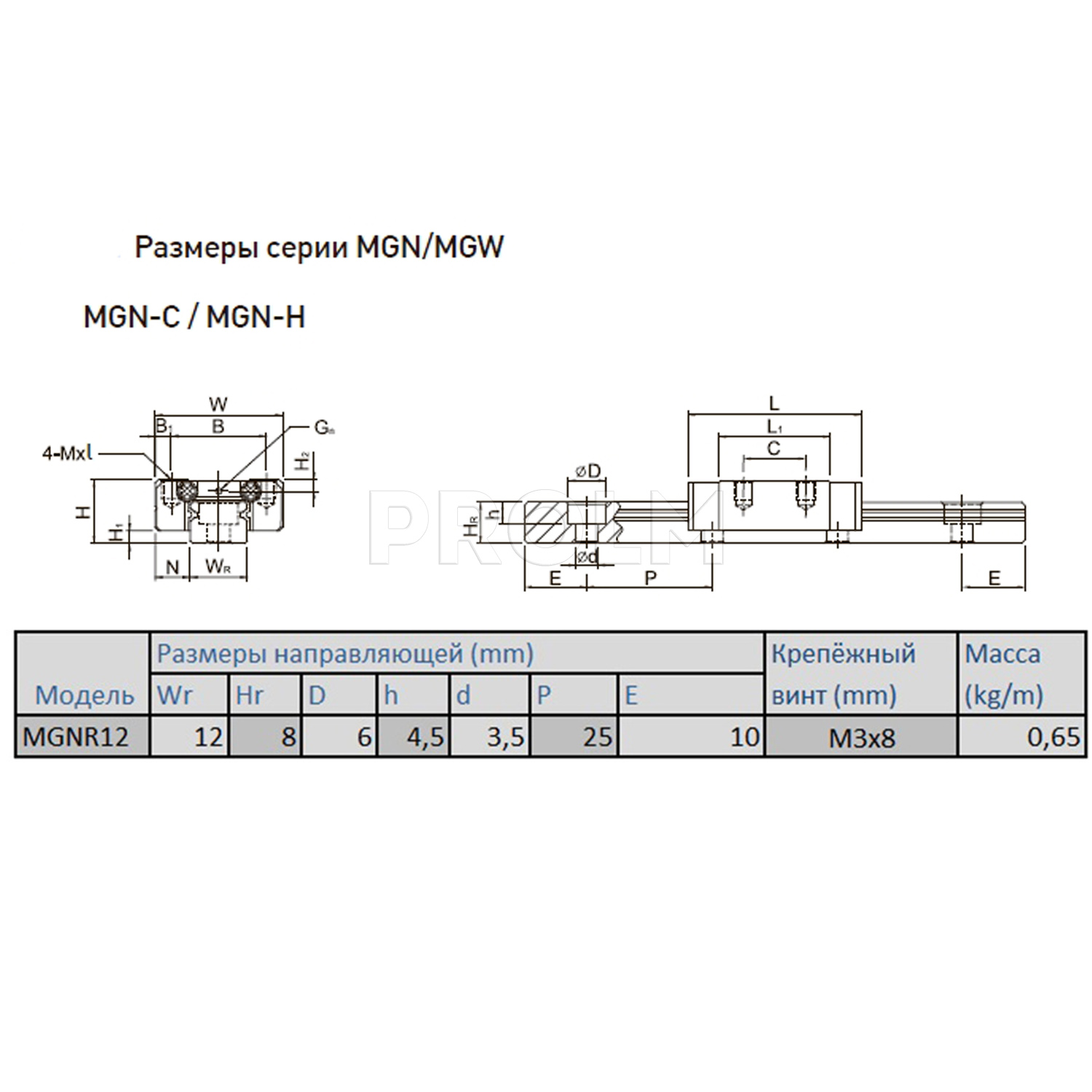 Профильная направляющая (рельс) HIWIN MGNR12R_CM для систем линейных перемещений имеет следующие характеристики: