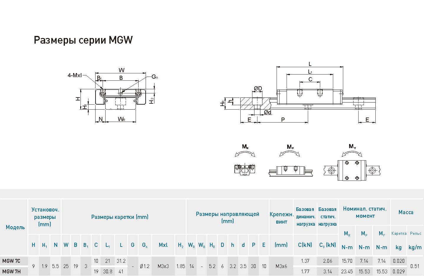 Каретка (также могут использоваться названия "блок системы линейного перемещения", "опорный блок", "направляющий блок", "танкетка", "линейный подшипник", "опорный подшипник" и прочие) HIWIN MGW7HZ0HM имеет следующие параметры: