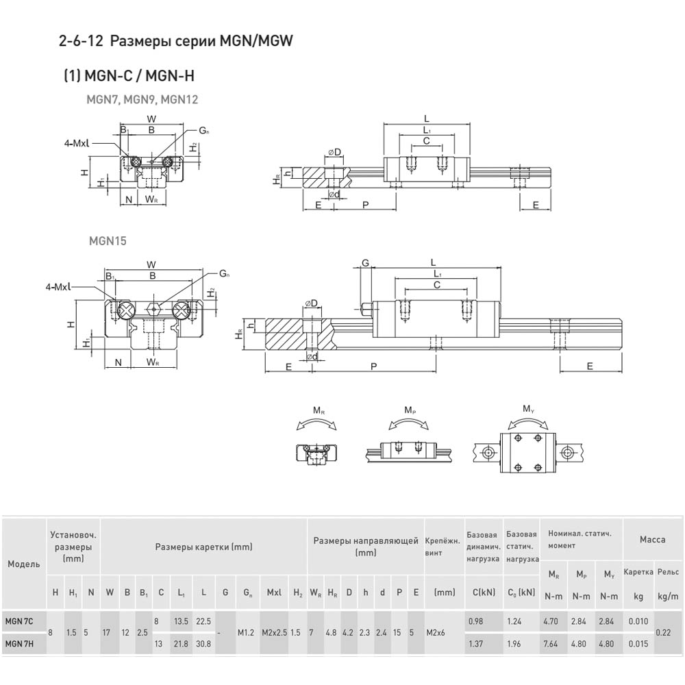 Каретка (также могут использоваться названия "блок системы линейного перемещения", "опорный блок", "направляющий блок", "танкетка", "линейный подшипник", "опорный подшипник" и прочие) HIWIN MGN7HZFCM имеет следующие параметры: