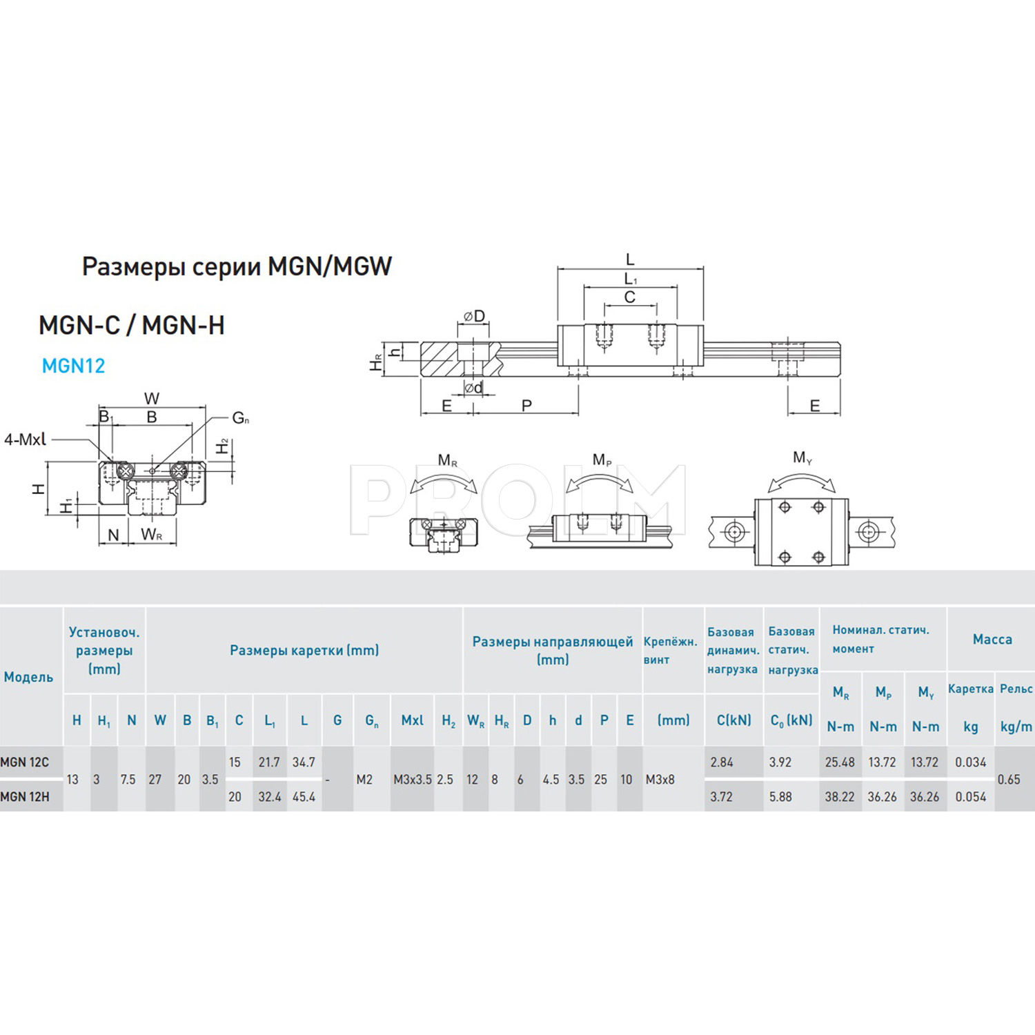 Каретка (также могут использоваться названия "блок системы линейного перемещения", "опорный блок", "направляющий блок", "танкетка", "линейный подшипник", "опорный подшипник" и прочие) HIWIN MGN12CZFPM имеет следующие параметры: