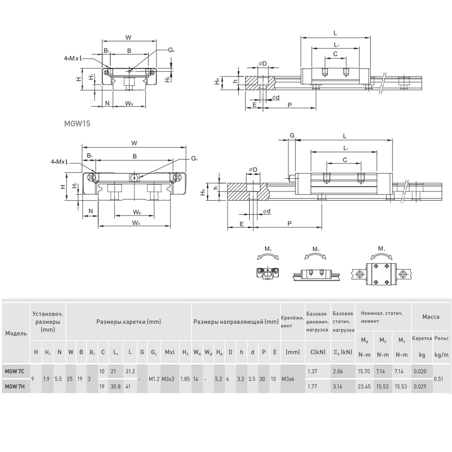 Каретка (также могут использоваться названия "блок системы линейного перемещения", "опорный блок", "направляющий блок", "танкетка", "линейный подшипник", "опорный подшипник" и прочие) HIWIN MGW7CZ0CM имеет следующие параметры: