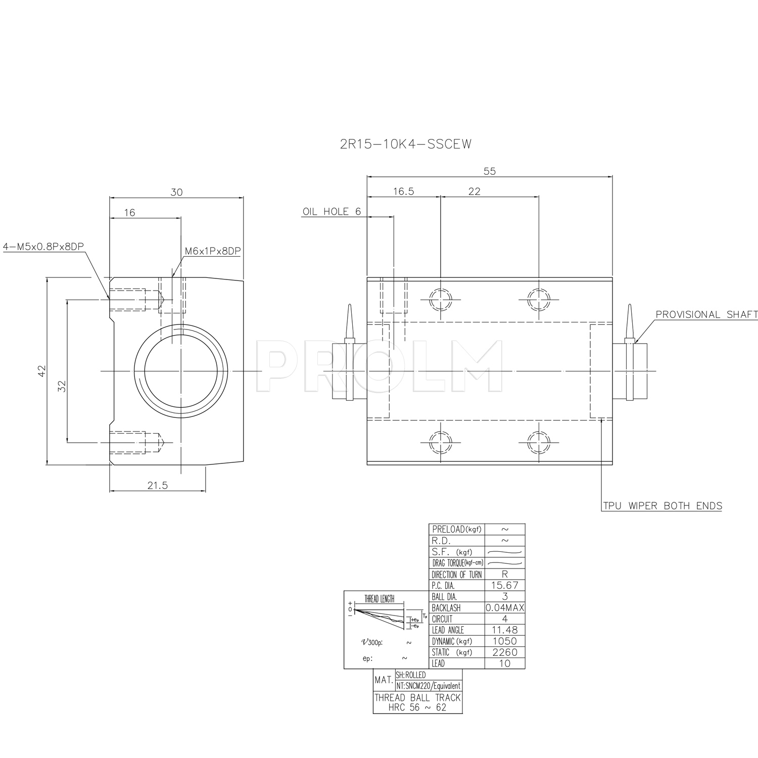 Прямоугольная одинарная гайка шариковинтового привода (ШВП) R16-10K4-SSCEW производства компании HIWIN с внутренним типом рециркуляции шариков, без предварительного натяга.