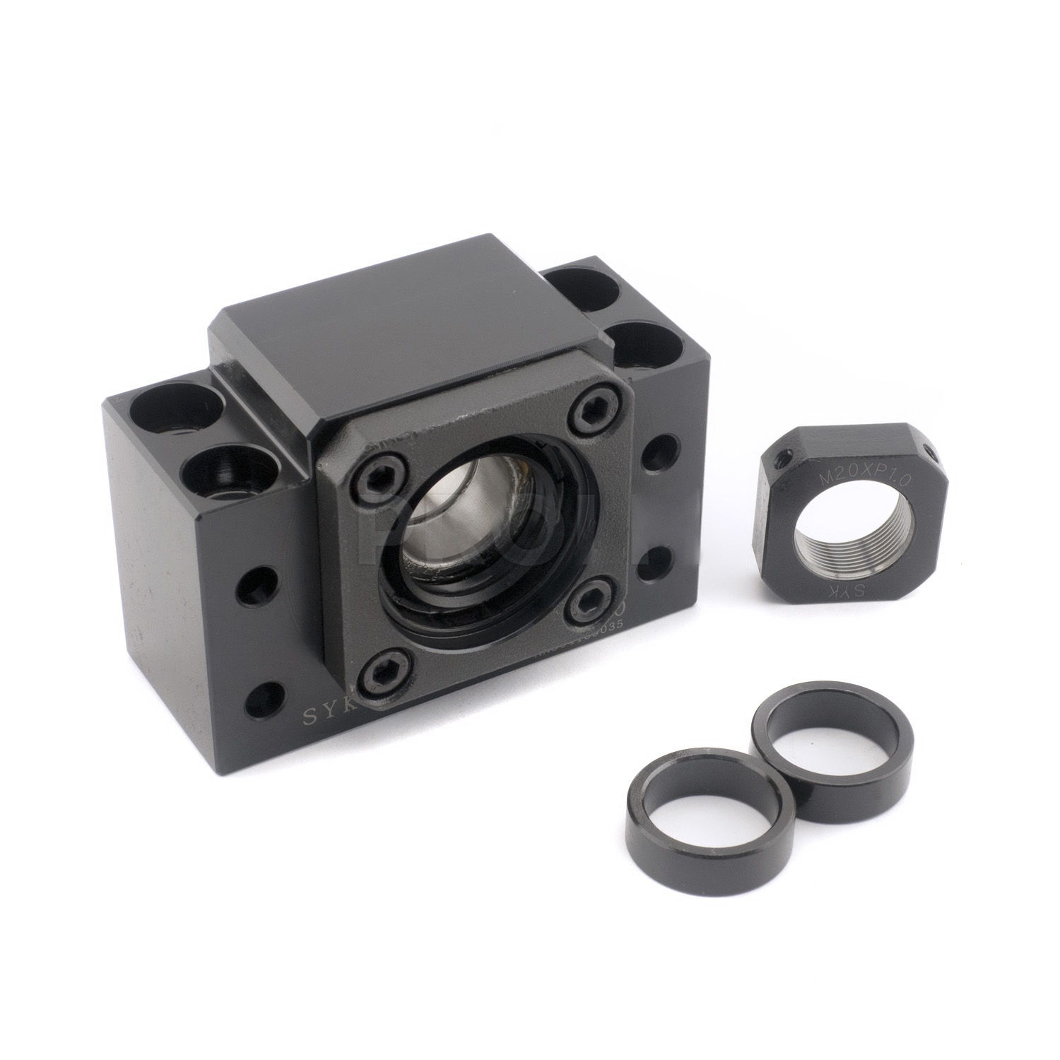 Фиксирующая опора для ШВП серии BK производства SYK состоит из дуплексного радиально-упорного подшипника и корпуса с монтажными отверстиями. Опора предназначена для фиксации винта ШВП в радиальном и осевом направлениях. Используется для жесткой фиксации винта ШВП с приводной стороны. Опора предназначена для монтажа на параллельную либо перпендикулярную оси винта плоскости. Является парой для опоры серии BF.