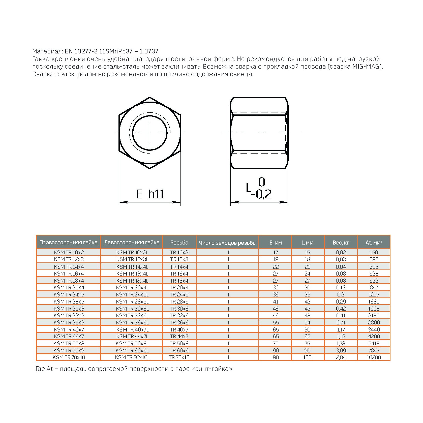 Гайка шестигранная для трапецеидального винта соответствующего типоразмера изготавливается из стали 11SMn30. Гайка предназначена для регулировки или фиксации оборудования. Соединение сталь-сталь используемое при работе под нагрузкой может заклинивать. Материал свариваемый. Указанная система может эксплуатироваться даже при наличии значительных загрязнений.