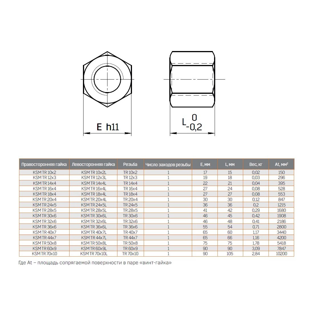 Гайка шестигранная для трапецеидального винта соответствующего типоразмера изготавливается из стали 11SMn30. Гайка предназначена для регулировки или фиксации оборудования. Соединение сталь-сталь используемое при работе под нагрузкой может заклинивать. Материал свариваемый. Указанная система может эксплуатироваться даже при наличии значительных загрязнений.