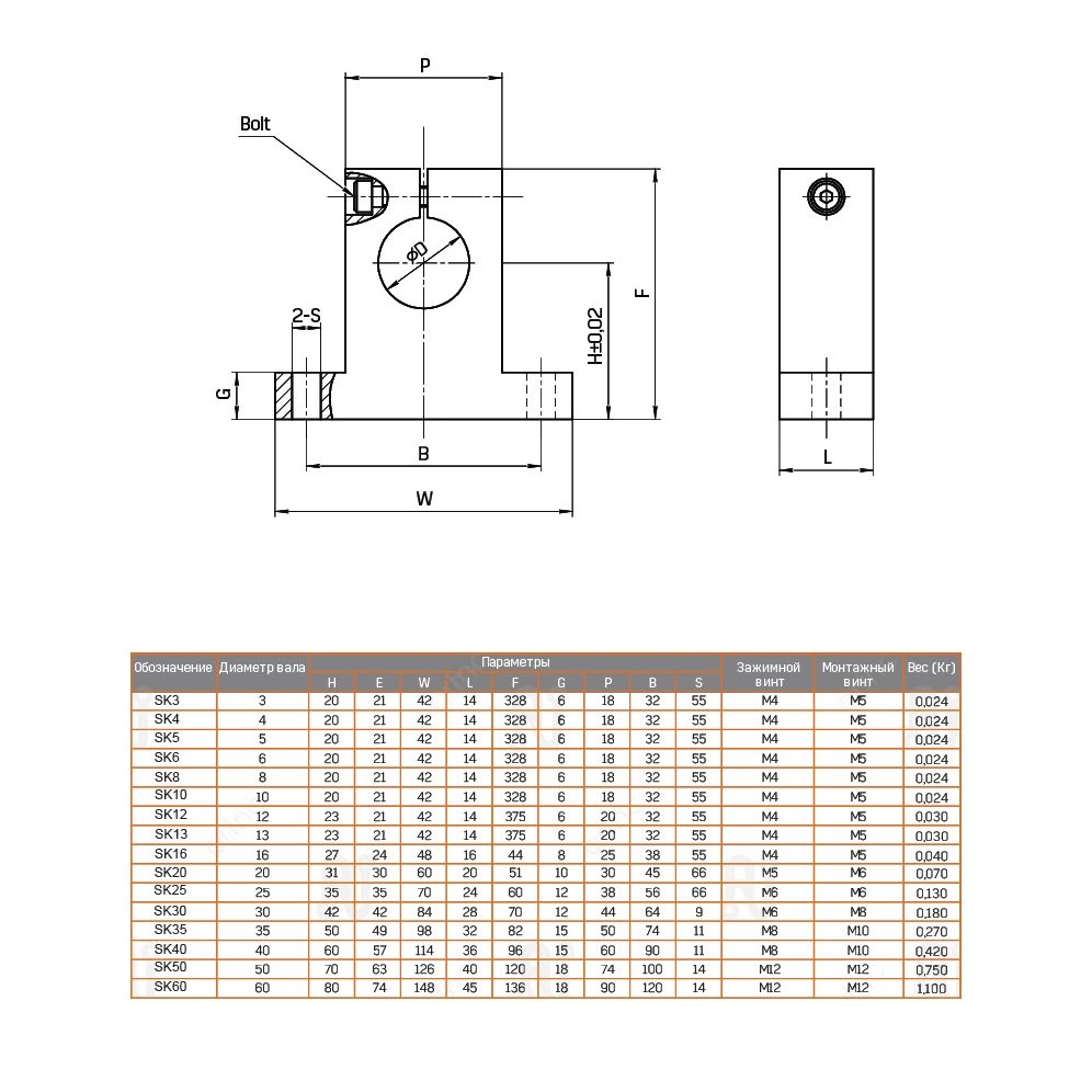 Крепление: вал фиксируется прижимным винтом, опора крепится к основанию двумя болтами.