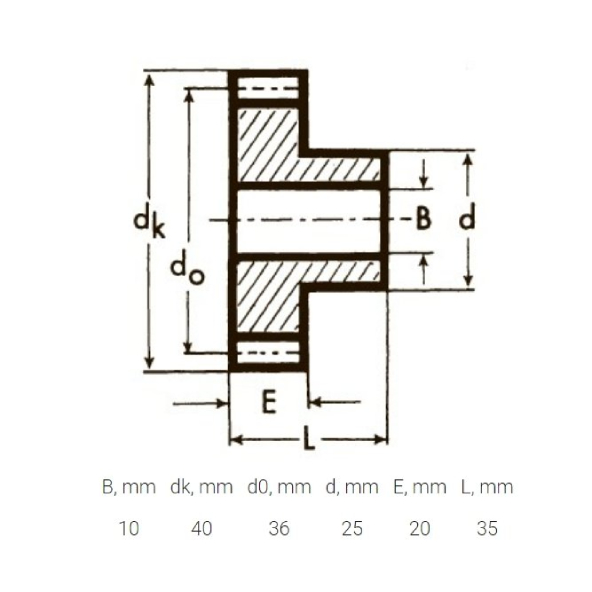 | B, мм | dk, мм | d0, мм | d, мм | E, мм | L, мм |